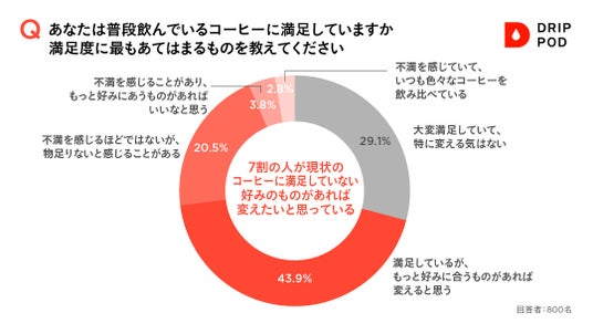 コーヒーの飲用頻度について聞いたところ、全体の6割(60.5%)がコーヒーを週に6~7杯以上飲んでおり、9割以上(94.1%)が自宅でコーヒーを飲むと回答しました。一方で、普段飲んでいるコーヒーに満足しているかどうかきいたところ、「大変満足している」と答えた人は約3割(29.1%)にとどまり、「もっと好みに合うものがあれば変える」「物足りない」と感じている人が約7割(70.9%)いることが分かりました。