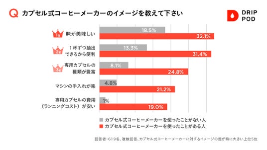 しかし、今回調査を実施したところ、「カプセル式コーヒーメーカーを持っている、あるいは使ったことがある人」と回答した人は17.1%と2割以下で、8割以上(82.9%)が利用したことがないという結果になりました。さらに、カプセルコーヒーに対して抱いている印象について聞いたところ、「カプセル式コーヒーメーカーを使ったことがある」と回答した人の多くは「味が美味しい」(32.1%)「1杯ずつ抽出できるから便利」(31.4%)「専用カプセルの種類が豊富」(24.8%)といった回答が多いのに対し、「カプセル式コーヒーメーカーを使ったことがない」と回答した人はこれらの選択肢の回答が少なく、カプセル式コーヒーメーカーの使用経験の有無によってイメージが大きくことなることが分かりました。これらの結果をカプセルコーヒーに対する誤解を解くチャンスと捉え、発信機会を増やし、カプセルコーヒーのメリットをより体験してもらう必要があると考えます。