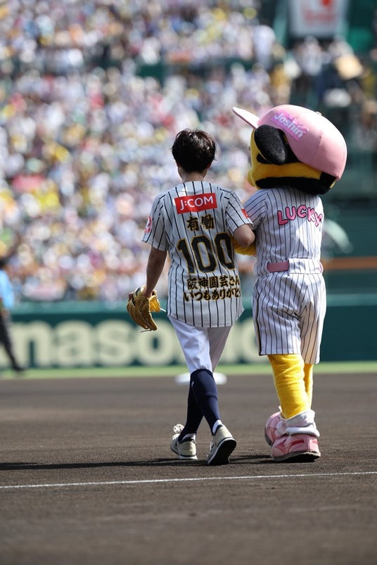 始球式には、関西出身で阪神タイガースファンを公言するフリーアナウンサーの有働由美子さんが、阪神甲子園球場の開場100周年へのお祝いや感謝の気持ちを込め、背番号「100」のユニフォームに身を包み登場。人生2回目の始球式では、ダイナミックな投球フォームから繰り出されるボールはノーバウンドでキャッチャーミットに収まり、試合前の会場を熱く沸かせました。始球式の模様は、J:COMの特設サイト(https://www2.myjcom.jp/special/tigers/)にて近日中に公開予定です。