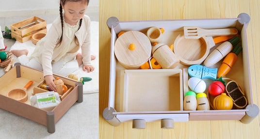 天板を外すと、キッチン本体にままごと食材や調理器具を収納することができ、「遊んだあとはお片づけ」の習慣が身に付きます。