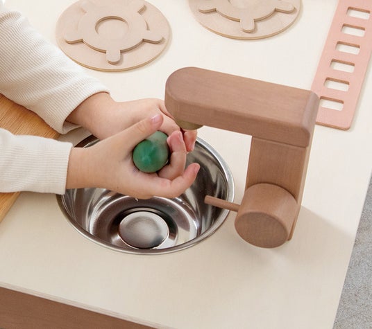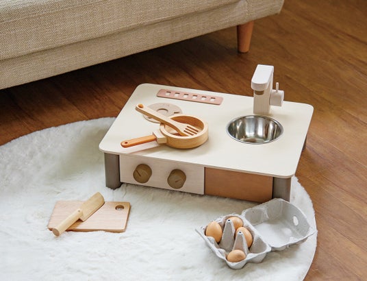 みんなが集まるリビングやダイニングに置いても、スッとなじんで心地よい空間に。日本の職人が丁寧に仕上げた、木の温かみを感じるままごとキッチン。