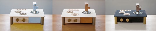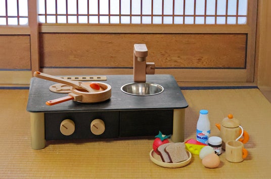 イメージしたのは「日本の台所」。夕方になるとトントン、ザクザク、グツグツ音が聞こえ、いいにおいが漂う空間。野菜を洗って切るお手伝いをしたり、グリルのお魚が焼けているか少し覗いてみたり。そんな日常の1コマが、ままごとでも再現できるようコンパクトなサイズにおさめました。