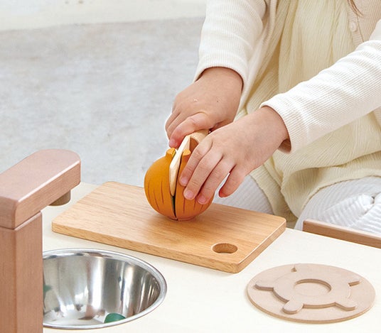 シンクで洗った食材をそのままカットできる調理スペースを広くとった天板で、GENIのままごとまな板をぴったり置くことができます。食材をしっかりおさえながら、もう片方の手でザクっと切る動作は、両手を思い通りに動かす練習にもなり、日常生活で必要な動作に繋がっていきます。