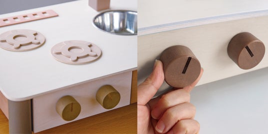 お鍋とフライパンで同時に調理できる2口コンロ。多くのご家庭でIHクッキングヒーターが普及する中、あえてガスコンロの五徳デザインを採用。「火」を使うことを直感的に学べる知育要素を重視しています。つまみを回して強火・弱火の調整をしたり、五徳に触れたり、お鍋を載せたりする動作を通して、楽しく遊びながら「火」を安全に取り扱うことを学べます。