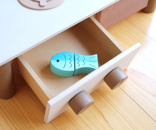 日本のキッチンならではの、引き出し式魚焼きグリルを搭載。フライパンで焼いたり、お鍋で煮たりする以外の調理法でままごとあそびの幅が広がり、日本の伝統である「和食」に親しむきっかけにもなります。魚以外にも肉や野菜をグリルするなど、想像力を豊かに育みます。