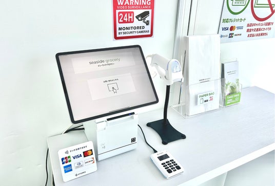 seaside grocery(シーサイドグロサリー)の無人販売所では、現金でのお支払いはできず、クレジットカードやQRコードでのキャッシュレス決済のみ対応しております。操作がとても簡単なタブレットによるセルフレジを導入し、お客様が簡単にご自身で購入が出来るデジタルを駆使した店舗となっています。