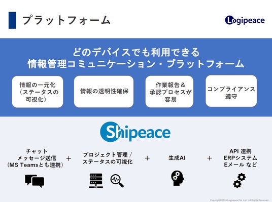 当社が提供する次世代コミュニケーションプラットフォーム『Shipeace』(シッピース)は、これらの課題を解決するために誕生しました。社内外で関わる人々が、いつでもどのデバイスでも状況を確認し、情報を共有またはアップデートすることが可能で、一つのプラットフォーム上で簡単に送信や登録ができます。そのため、これまで情報共有に費やしていた時間を削減し、本業に集中することができます。