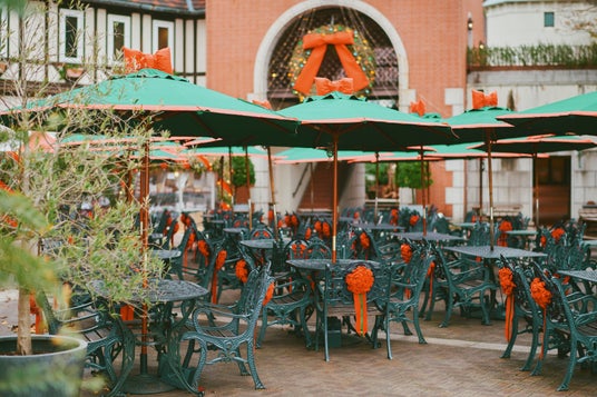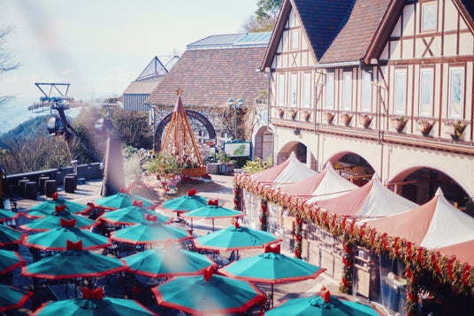 「チェアリボン&パラソルリボン」標高約400mの中世ヨーロッパの古城の空間。展望プラザ全体が赤いリボンでクリスマスカラーに染まります