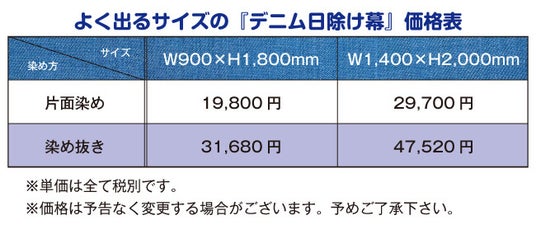「デニム日除け幕」は、店舗に合わせたオーダーサイズで製作可能です。サイズにより価格は異なりますが、通常の看板に比べてコストを抑えられる点も魅力です。取り外しが簡単で、シーズンごとの入れ替えもスムーズに行えます。