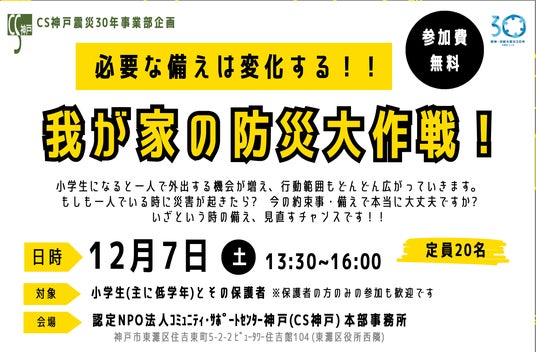 認定NPO法人コミュニティ・サポートセンター神戸(CS神戸)は、阪神・淡路大震災を契機に、「自立と共生」を理念とした地域社会をめざし、自ら活動する人々を応援する民設民営のサポートセンターです。共生循環型のまちづくりやNPO手法によるコミュニティ事業を行う団体の立ち上げや運営を支援しています。 震災30年の節目を迎え、立ち上げから支援している活動団体にエールを送ると共に、改めて防災について家族の中で考える機会を作り、大切さを伝えたいと考え企画しました。防災について一緒に学び、地域課題の解決するために活動している団体を身近に感じていただければ幸いです。