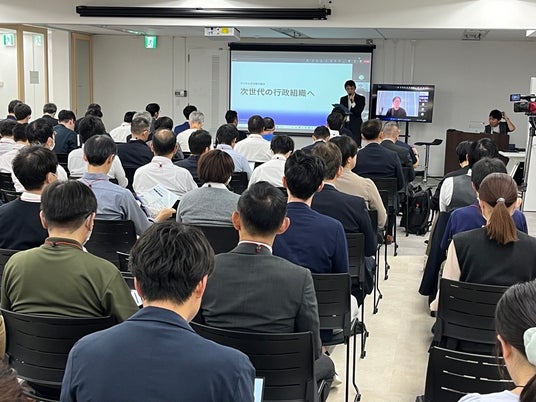 デジタル庁のオフィスからリモート参加したデジタル監 浅沼尚氏の基調講演を神戸市の会場で視聴