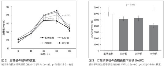蒟蒻繊維素材ニンジャペーストを緑茶に添加したものを使用して、「血糖値スパイク」に関連する食後時間における血糖上昇抑制効果を調べました。ご飯摂取の10分前に試験飲料を摂取させた場合、基準値と比較して食後30分および60分の血糖値は有意に減少(p<0.01, p=0.003)。血糖上昇曲線下面積(IAUC)も、ご飯摂取の10分前に試験飲料を摂取させた場合に基準値と比較して、有意に減少( p=0.003)しました。