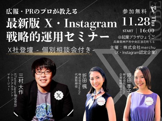 株式会社merchu(メルチュ / 代表 折田 楓)は「広報・PRのプロが教える 最新版X・Instagram戦略的運用セミナー」を11月28日(木)に起業プラザひょうごにて開催します。参加無料です。