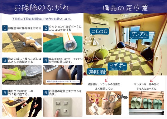 - ご退室前に、下記の「お掃除のながれ」にしたがって掃除する。掃除が終わったら「お掃除チェックリスト」に・をいれて所定の場所に置く。