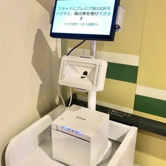 - 船内2階の自動ゲート内のセルフ発券機(※)で、1.特典引換用のQRと2.プレミア席のQR、2つを順に読み取り、「コーヒー無料券」と「お掃除チェックリスト」を発行する。