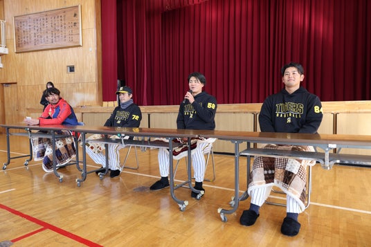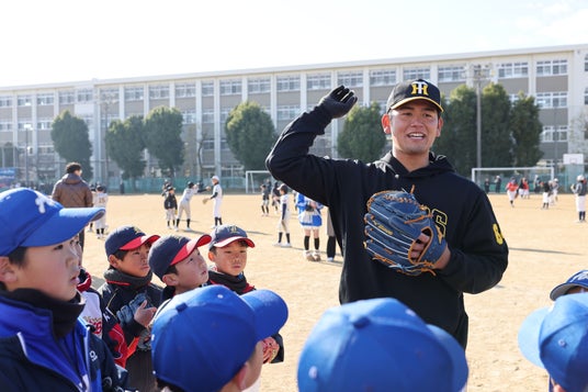会場となった姫路市立山陽中学校には、姫路市、たつの市、宍粟市、太子町の9つの野球チームから子どもたち約200名が集い、江草仁貴コーチ(阪神タイガース)・前川右京選手(阪神タイガース) 岡留英貴選手(阪神タイガース)・狩野恵輔さん(阪神タイガース OB・解説者)、計4名の講師が、子どもたち一人ひとりに直接指導しました。