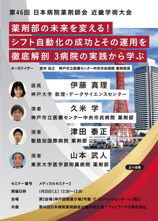 効率的な勤務計画の作成を通じてエッセンシャルワーカーやフィールドワーカーの働き方を改善し、企業の経営を支援するウィンワークス株式会社(東京都千代田区、代表取締役:森庸輔、以下ウィンワークス)は、2025年1月25日に神戸国際展示場で開催される第46回日本病院薬剤師会近畿学術大会においてランチョンセミナーを共催します。本セミナーでは、神戸市立医療センター中央市民病院、聖路加国際病院と東京大学医学部附属病院の薬剤部が、WINWORKS Oneを活用して実践した勤務シフト自動作成の運用と成果を解説します。