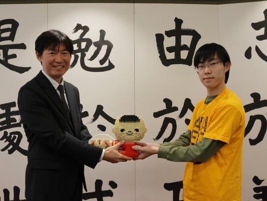 2025年に創業75周年を迎えるにあたり、周年企画として、以前から憧れていた灘校LEGO同好会にケンミンぼうやのレゴ作品を制作していただき、とても感謝しています。生徒の皆さんが、設計から組み立てまで細部にこだわって作られたことを知り、とてもうれしく思います。多くの方に見て頂けるよう本社で展示します。
