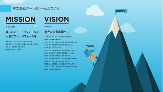 アートリフォームは「暮らしにアートリフォームを。人生にアートリフォームを。」というミッションを掲げ、リフォームというサービスを世の中に浸透させていくとともに、関わる全ての人の暮らしと人生を豊かにすること、リフォームというサービス・業界をより魅力的にしていくことに取り組んでいます。従業員がイキイキと働ける環境づくりを継続することが、ミッションの実現につながると考え、今後も魅力的な組織づくりに挑戦します。