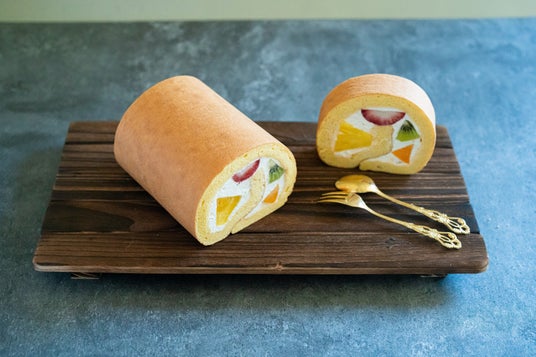 市場から直送のさまざまフルーツを盛り込んだ贅沢ロールケーキ。しっとり食感のロール生地にいちご、キウイ、パイン、黄桃を巻き込みました。