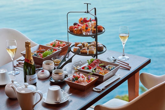 本プランでは、御食事の提供が集中する時間帯を避けて少し早めの夕御膳をお客様の客室までお届けします。アペリティフのスパークリングワイン(ノンアルコールも有り)で食欲を刺激した後は、夕焼けに染まる海を眺めながら御食国と称される淡路島の旬の海の幸や淡路牛などをまるで珠玉を集めた玉手箱のように詰め込んだ御膳と、淡路島の食材や旬の果物を使いホテルパティシエが手作りする目にも愉しい色とりどりのスイーツやスコーン、セイボリーなどをスイーツタワーにのせてサービスいたします。