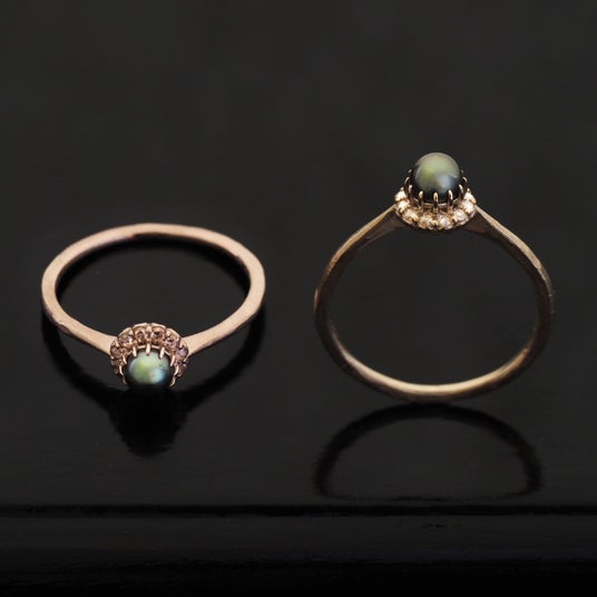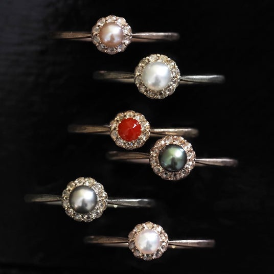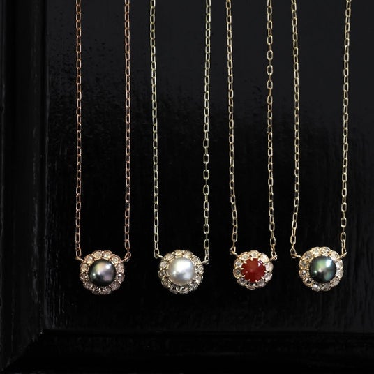 今回は、3.5mmと4.0mmサイズの真珠や珊瑚を、極小 1.2mmローズカットで取り巻いた繊細なデザインにアップデート。有機宝石ならではの、内側から滲み出るような色艶を、どこか懐かしいクラシカルな雰囲気で纏っていただけます。