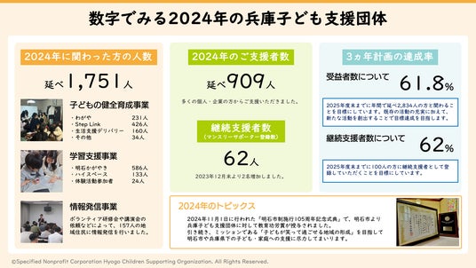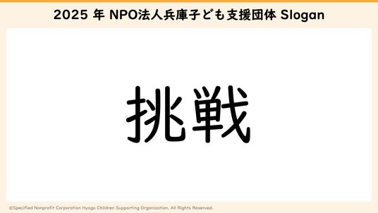 さて、2025年は法人スローガンとして「挑戦」を掲げています。多くの個人・企業の方からご支援を頂く法人になってまいりました。それほど子ども支援の重要性や当法人の活動に対する期待が高まっている証拠であると感じています。頂いたご支援とその思いをより子どもたちに還元するためにも新たな活動等にも挑戦していき、兵庫県下の子どもやその家庭への支援を広げていきたいと考えています。また、持続可能な団体運営を行うために、より一層私たちの活動への賛同者を増やしていくことで、組織基盤・財政基盤を強固なものとしてまいります。私たちの活動を拡げていくことによって、未来を担う子どもたちの笑顔が一つでも増えることを願っています。