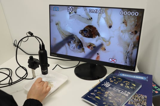チリメンに隠れた生きものだーれだ!チリメンジャコの中には、イワシ類の稚魚の他にタコやイカなどさまざまな生きものが混じっています。スコープで拡大して観察し、どんな生きもが隠れているのか探し出します!