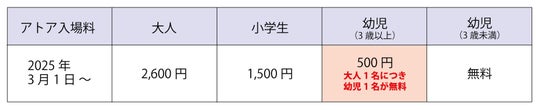 ・入場料:大人(中学生以上)2,600円、小学生1,500円、幼児(3歳以上)500円、3歳未満無料