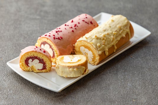 「昭和100年 令和の昭和ロールケーキ」 ふわふわの生地とバタークリームの溶け出る甘みが美味しいケーキです いちごジャムのトップにはチョコレートとラズベリーのドライフルーツ、マーマレードのトップにはチョコレートとオレンジのドライフルーツをコーティングしています