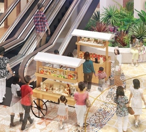 りスペースや、買物広場に面したテラス席を設けます。