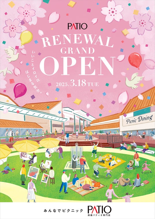 「みんなでピクニック、須磨パティオ。」をコンセプトに、2025年3月18日にリニューアルグランドオープンします。フードコートやシェアキッチン、屋上ひろばの新設など、新しく生まれ変わった須磨パティオに是非お越しください。