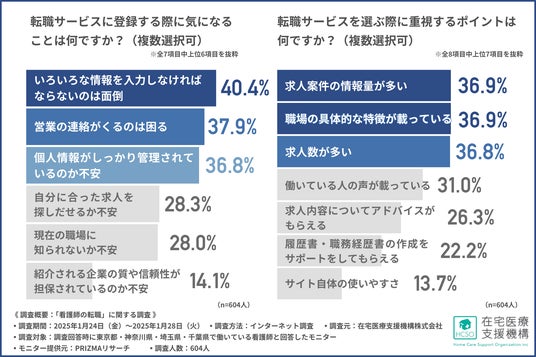 また、登録時の懸念点として「個人情報の取り扱い」や「営業連絡の頻度」をあげている方が多く、これらの不安を払拭する取り組みが求められていることが示唆されました。また、転職サービス選定においては「求人情報の充実度」「職場の具体的な情報」「求人数の多さ」が重視されており、転職希望者がリアルな情報を重視していることがわかりました。