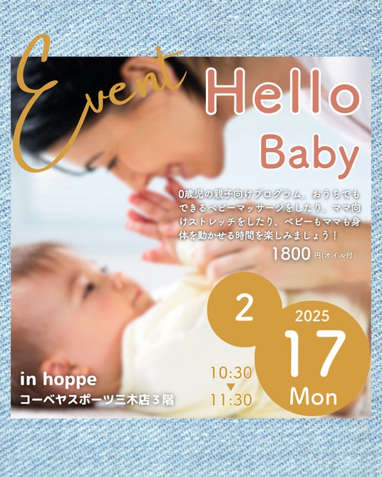 特定非営利活動法人ほっぺ(兵庫県三木市・代表:大森 奈津子)は親子向けイベントとして、2025年2月17日(月)にhoppe(コーベヤスポーツ三木店3階)にて、ふれあいあそびやベビーマッサージ体験ができる「Hello Baby」を開催いたします。