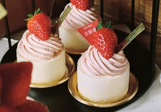 芳醇な甘みの苺ムース、 なめらかなホワイトチョコムースの中に、甘酸っぱいフランボワーズをしのばせ、一粒の古都華いちごを宝石のようにトッピング。