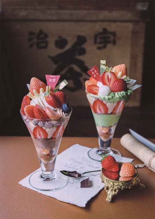 濃厚な抹茶アイスとクリームにカスタードや爽やかないちごアイスを重ね、福岡県産あまおうと奈良県産淡雪いちごを贅沢にトッピング。