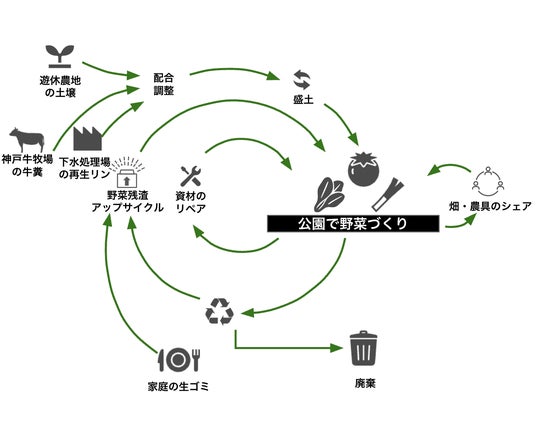 農具・資材・種などが附帯され初心者の方でも手軽に野菜づくりを始めることができるほか、LINEと連携したスマホアプリにより、いつでも野菜づくりのステップや病害虫に関する質問をすることができるサポート付の農園になります。街区公園であったスペースを、市内の遊休農地の土を再利用し、こうべSDGs肥料(こうべ再生リン)、神戸牛牧場の堆肥を活用して再整備を実施し、地域循環型の農園としての実証実験を開始します。