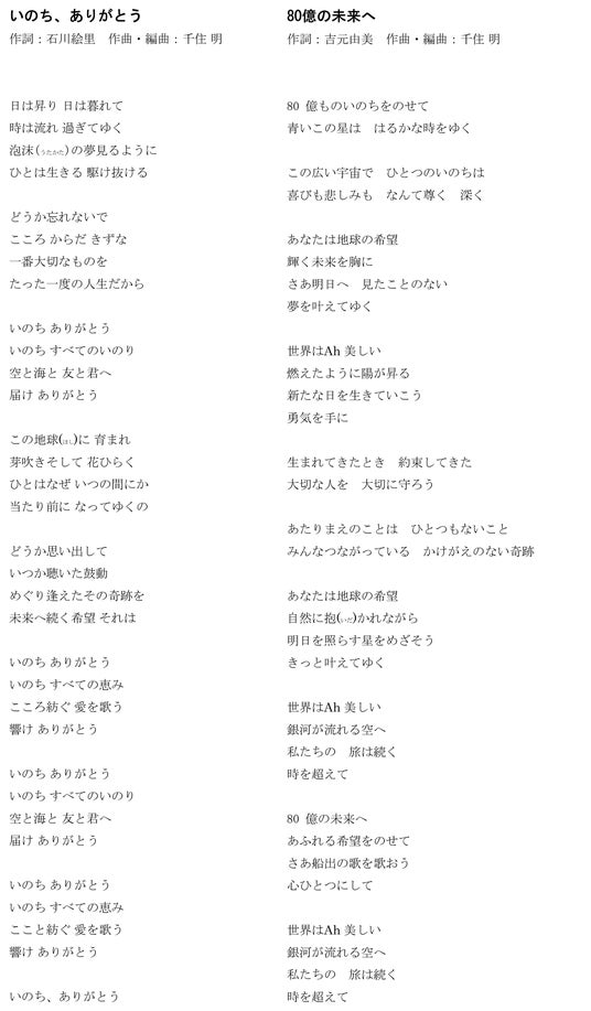 大切な人に出会ったとき、生まれてきてくれてありがとうと感謝するように、大切な人を失ったときもまた、同じようにその人のいのちに感謝するものです。生きていると、つらいこともありますが、一生懸命に生きる姿は何よりも尊く、そのいのちの輝きに、私たちは感動し、心動かされるのだと思います。世界中のいのちの輝きが集まる万博に、歌で参加できる喜びを感じています。