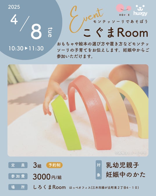 特定非営利活動法人ほっぺ(代表:大森 奈津子)は、ほっぺオフィス(兵庫県三木市)にて開催される親子参加型のイベント「こぐまRoom」の参加者を募集します。当団体が運営する認可外保育園しろくまRoomのお部屋にあるモンテッソーリ教具で遊びながら過ごせます。おもちゃや絵本の選び方、置き方などモンテッソーリを取り入れた子育てをお伝えします。妊娠中の方もご参加いただけます。ぜひ一度、「こぐまRoom」を体験してみませんか?4月8日(火)10時30分~11時30分までの開催となります。