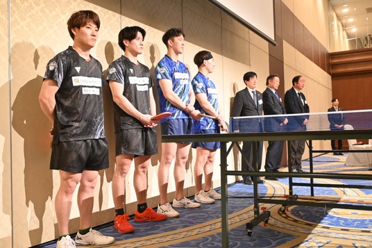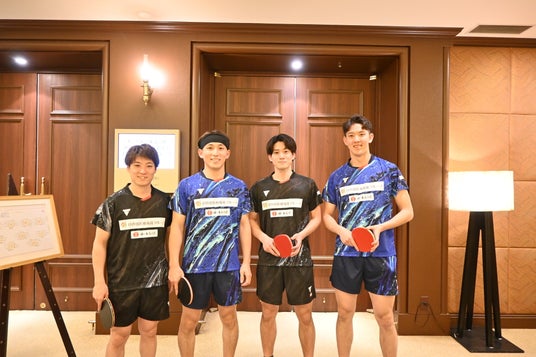 入社式後の懇親会にて卓球チーム発足を披露 画像左から、英田理志選手、馬渡元樹選手、松下大星選手、五十嵐史弥選手