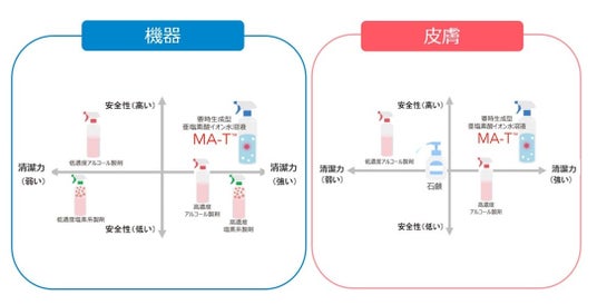 MA-T(R)とは革新的酸化制御技術であり、微量なラジカルを安定的に発生させるメカニズムです。当該技術は高い除菌消臭効果が期待できるだけでなく成分の99%が水で構成されており、安全性も極めて高いため肌や口腔への応用展開も進んでおります。装置や肌に対しても清潔な環境作りに寄与し、既に多くの飛行機・ホテル・病院・歯科医院等でMA-T(R)採用の製品が導入されています。