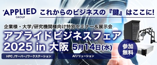 アプライド株式会社(本社:福岡県福岡市、代表取締役社長:岡義治)は、2025年5月14日(水)にアプライド大阪事務所にて、法人様、個人事業主様、大学・専門学校様を対象とした「一歩先を行くビジネス提案 アプライドビジネスフェア2025in大阪」を開催いたします。本イベントでは、最新のAI技術、ビジネスコンピューター、ワークステーション、サーバーソリューションに関する展示・商談会と、専門家による無料セミナーを実施し、ビジネスの課題解決とDX推進を支援いたします。