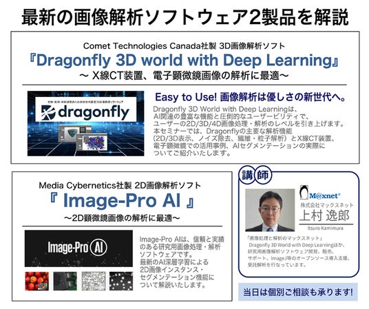 - AI画像解析ソフトウェア「Dragonfly/ImageproAI」展示:最新の画像解析ソフトウェア2製品をご紹介。1. Comet Technologies Canada社製 3D画像解析ソフト『Dragonfly 3D world with Deep Learning』X線CT装置、3D電子顕微鏡画像の解析に最適2. Media Cybernetics社製 2D画像解析ソフト 『Image-Pro AI』2D顕微鏡画像の解析に最適