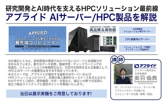 - 最先端コンピューターソリューション展示: ワークステーション/HPC/AIサーバーなど最先端コンピューターの実機を展示します。