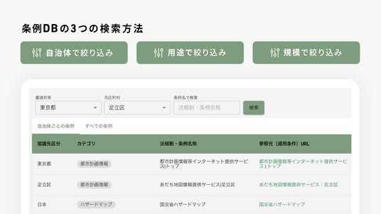 「条例DB」は不動産事業者、建築主向けの、建築に関わる条例調査を効率化するWebサービスです。