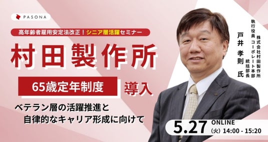 株式会社パソナは経営層や人事のご担当者様へ向けたウェビナー「シニア層活躍セミナー」を5月27日(火)に開催いたします。
