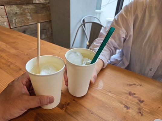 1. お客様が店内でドリンクを楽しむ「norosi.kobe」の飲食スペースでは、アドリブワークスの自社農園で育てた国産ライムを使ったジュースや、スタートアップが手がけるこだわりの食品を提供しています。使用されるのは、環境負荷の低い紙コップです。