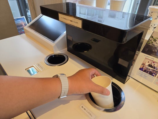 2. 飲み終えた紙コップを「NAWA」のスマートゴミ箱に投入店内に設置されたNAWAのスマート分別機が、AIカメラと重量センサーを活用して紙コップの材質・状態を判別。適切な処理対象のみを自動で回収します。誤廃棄防止や回収ログの取得も可能です。