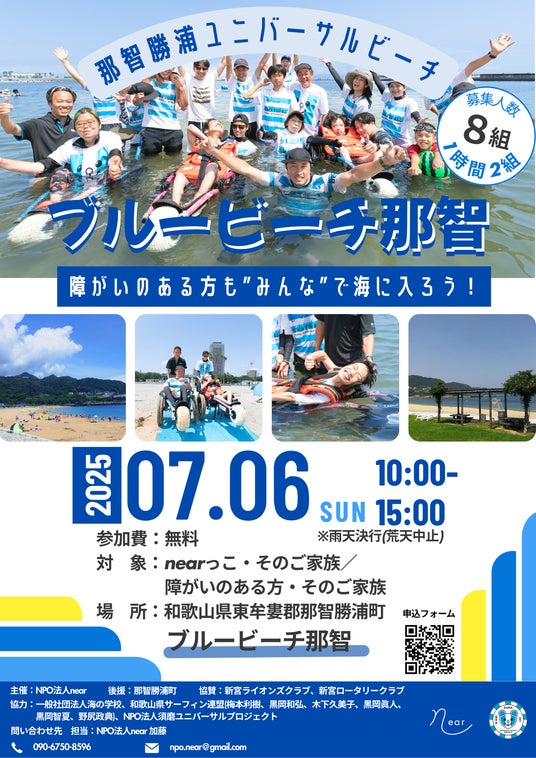 ユニバーサルビーチを通じて、nearさんとつながれたことで、今回、新たなチャレンジが始まります。一般的には、夏のレジャーとして定番の”海水浴”が、医療ケアが必要な方にとっては”大冒険”になります。でも、だからこそ、一緒に海水浴ができたら、大きな自信につながると確信しています。那智勝浦での初開催です。みんなでチャレンジしましょう!(代表・木戸)