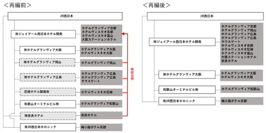 JR西日本グループは、ホテル事業を経営・運営するJR西日本ホテルズに関して、同ホテルズを統括する、株式会社ジェイアール西日本ホテル開発を中心として、これまで地域と共に積み重ねてきた信頼をさらに成長、発展させるため、同社とホテル子会社4社(株式会社奈良ホテル、株式会社ホテルグランヴィア岡山、株式会社ホテルグランヴィア広島及び尼崎ホテル開発株式会社)について、合併による会社再編を行うこととしましたので、以下の通りお知らせします。